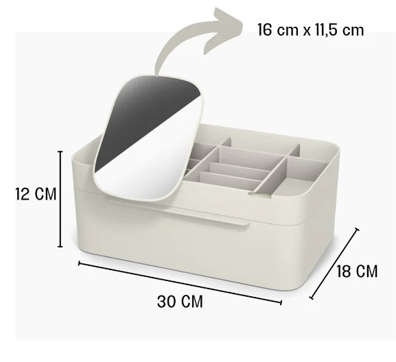 Múltiples compartimentos: compuesto por varios compartimentos de diferentes tamaños, el organizador puede acomodar una amplia variedad de productos, desde lápices labiales y pinceles hasta paletas de sombras de ojos y productos para el cuidado de la piel.